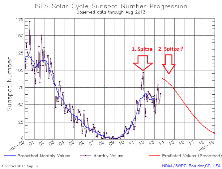 Eine mögliche Erklärung ist, dass es eine „Solare Doppel-spitze“ gibt und wir uns derzeit im Tal zwischen den Spitzen befinden. Wir berichteten bereits im März 2013 : https://sonnen-sturm.info/sonnenzyklus-update-2015-ein-weiterer-hohepunkt/ . Bereits die letzten beiden Sonnenfleckenzyklen, um 1989 und 2001, zeigten ein solches Verhalten. Wenn dies auch in diesem Zyklus zutrifft, könnten wir mit einem erneuten Anstieg der Sonnenaktivität Ende 2013 bis 2014 rechnen. Mit Sicherheit kann das jedoch keiner sagen. Forscher studieren die Sonnenflecken seit mehr als 400 Jahren und können immer noch nicht vorhersagen, wie sich der solare Zyklus im Zukunft verhalten wird.