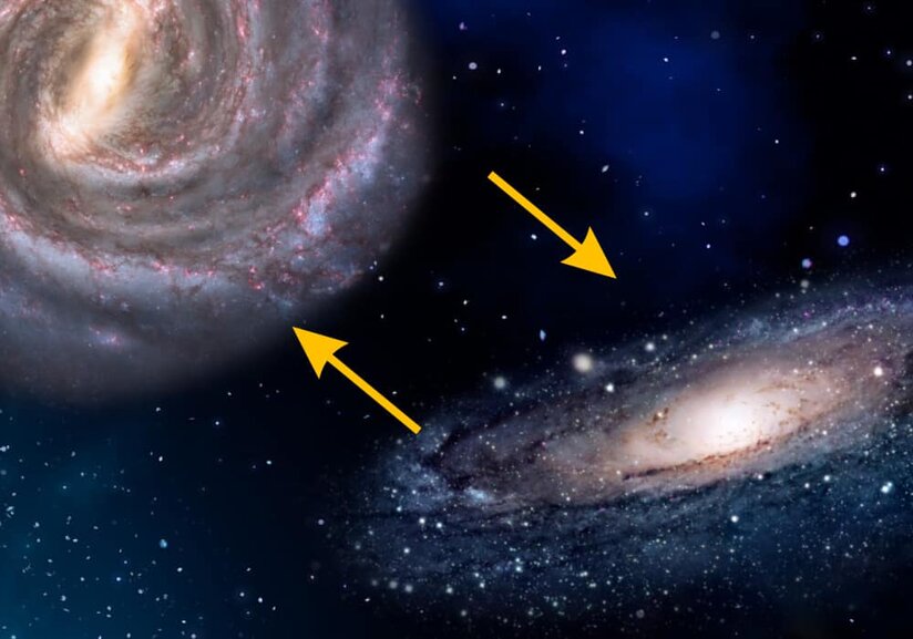 Frage: wie kommt es dazu, dass sich Milchstrasse und Andromeda einander nähern und schliesslich kollidieren ?