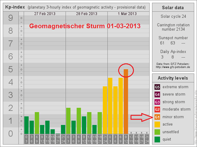 Der starke Sonnenwind wird bis zum 03.03.2013 anhalten und für ein unruhiges Erdmagnetfeld sorgen. Vereinzelte kurze Sturmperioden der Klasse G1 sind nicht ausgeschlossen.