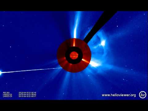 Der Sonnenfleck 1719 dreht sich derzeit über den westlichen Horizont der Sonne und sorgte gestern um 20:22 Uhr MEZ für eine Sonneneruption der Klasse C 6.5. Bei der Eruption löste sich ein Koronaler Massenauswurf, der sich in Richtung Westen bewegt und somit die Erde nicht treffen wird. Der KMA bewegt sich derzeit in Richtung Merkur und wird diesem voraussichtlich am 20 April treffen. Die NASA-Sonde Messenger , die sich in der Umlaufbahn vom Merkur befinden, wird den Aufprall des KMA aufzeichnen. Da der Merkur nur ein sehr schwaches Magnetfeld besitzt, ist es möglich, dass der KMA Material von der Oberfläche mitreißt und so einen kometenhaften Schweif verursacht.