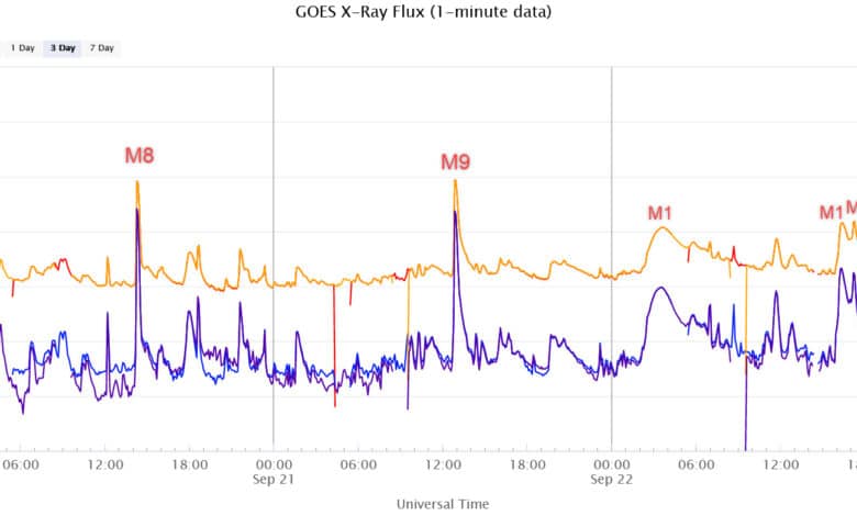 Eine Reihe von Sonneneruptionen der M-Klasse hat in den letzten Tagen zahlreiche koronale Massenauswürfe in Richtung Erde gesandt. Wenn Massenauswürfe auf das Erdmagnetfeld treffen, kann es zu geomagnetischen Stürmen kommen.